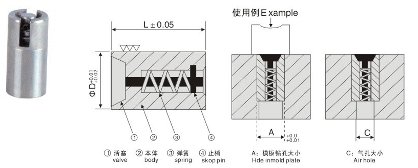 1 .空氣銷用在有深度、 密閉之真空狀態(tài)下, 頂針頂出困難時用之, 且産品面積大, 不容易脫落時, 亦可采用之。