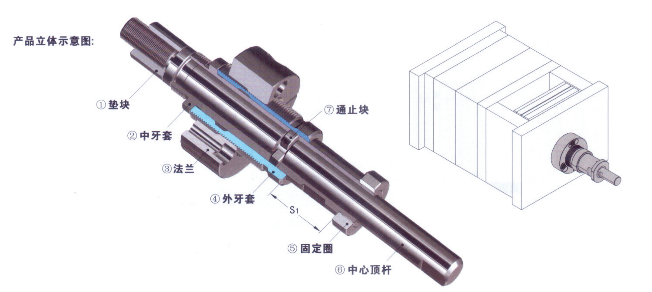 旋轉(zhuǎn)外牙套,調(diào)節(jié)外牙套與法蘭的相對位置即可在規(guī)定的范圍內(nèi)設(shè)定第一次頂出行程 “S1”的位置,設(shè)定后再將法蘭鎖緊;